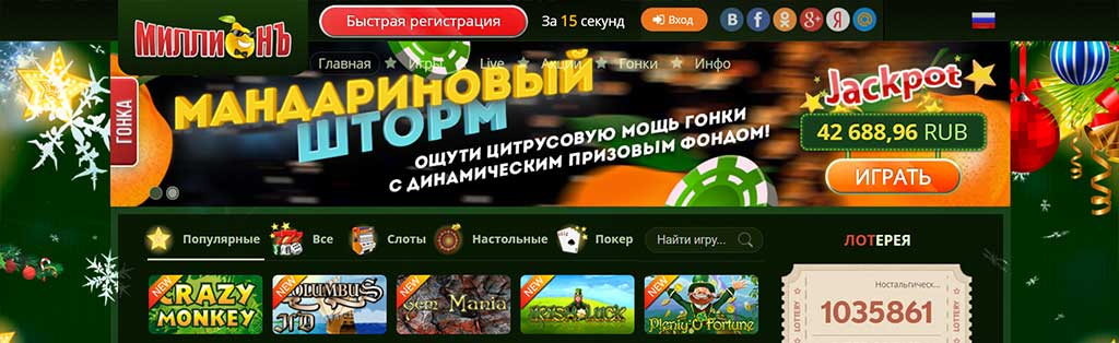 Игровой клуб Миллион предлагает 500 рублей за регистрацию для новых игроков. Бонус доступен для всех стран и в все игры. Максимальный вывод с бонуса составляет 1 500 рублей.